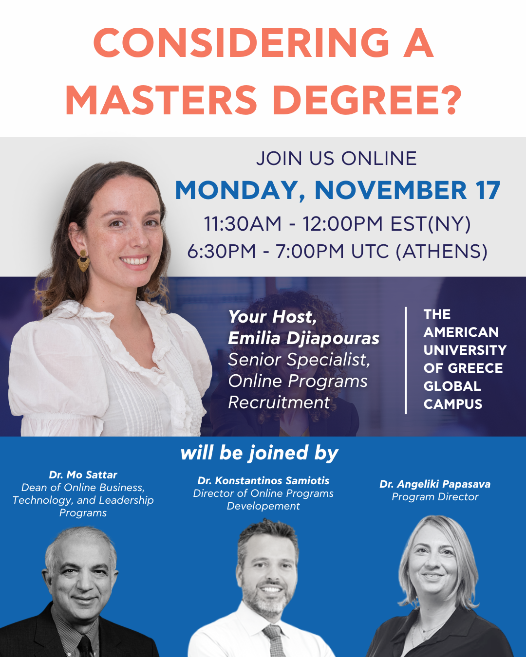 Join us for a dynamic 30-minute webinar where we’ll spotlight The American University of Greece Global Campus' cutting-edge graduate programs designed with you in mind.
